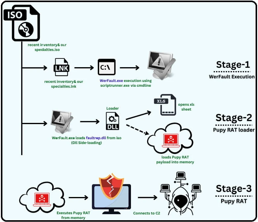 Campania malware are ca punct de pornire primirea unui mail ce conține un atașament ISO ce se va monta ca un nou disc care conține o copie legitimă a executabilului Windows WerFault.exe, un fișier DLL („faultrep.dll”), un fișier XLS („File.xls”) și o scurtătură („inventory & our specialties.lnk”).