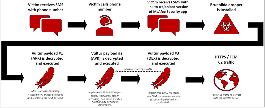 Un raport al Fox-IT, parte a NCC Group, avertizează că o nouă versiune mai evazivă a malware-ului Vultur se răspândește printr-un atac hibrid care se bazează pe smishing (phishing prin SMS) și apeluri telefonice care păcălesc țintele să instaleze o versiune a malware-ului care se deghizează în aplicația McAfee Security.