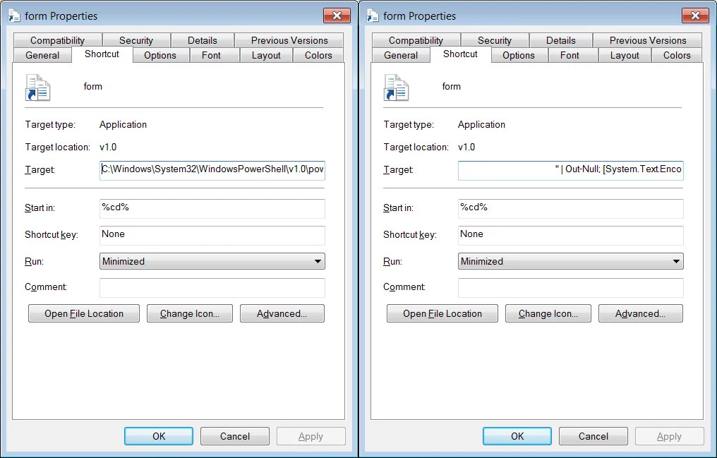 Fișierele .lnk au mai fost folosite anterior în atacuri, împreună cu codul Visual Basic Script (VBS). Acum este pentru prima dată când au folosit scurtături Windows pentru a executa direct comenzi PowerShell.
