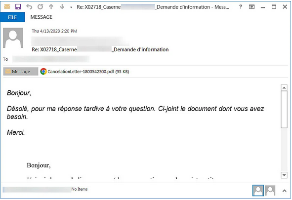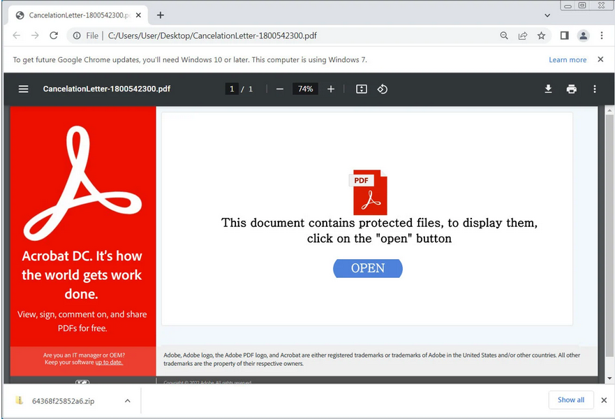 În cadrul acestor tipuri de e-mailuri sunt atașate fișiere PDF (exemplu: CancelationLetter-[number].pdf) care, odată accesate afișează diverse mesaje, cum ar fi: This document contains protected files, to display them, click on the open button.