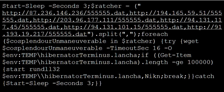 Scriptul PowerShell care este executat de fișierul WSF încearcă să descarce un DLL dintr-o listă de adrese URL. Fiecare URL este încercat până când fișierul este descărcat cu succes în folderul %TEMP% și executat.