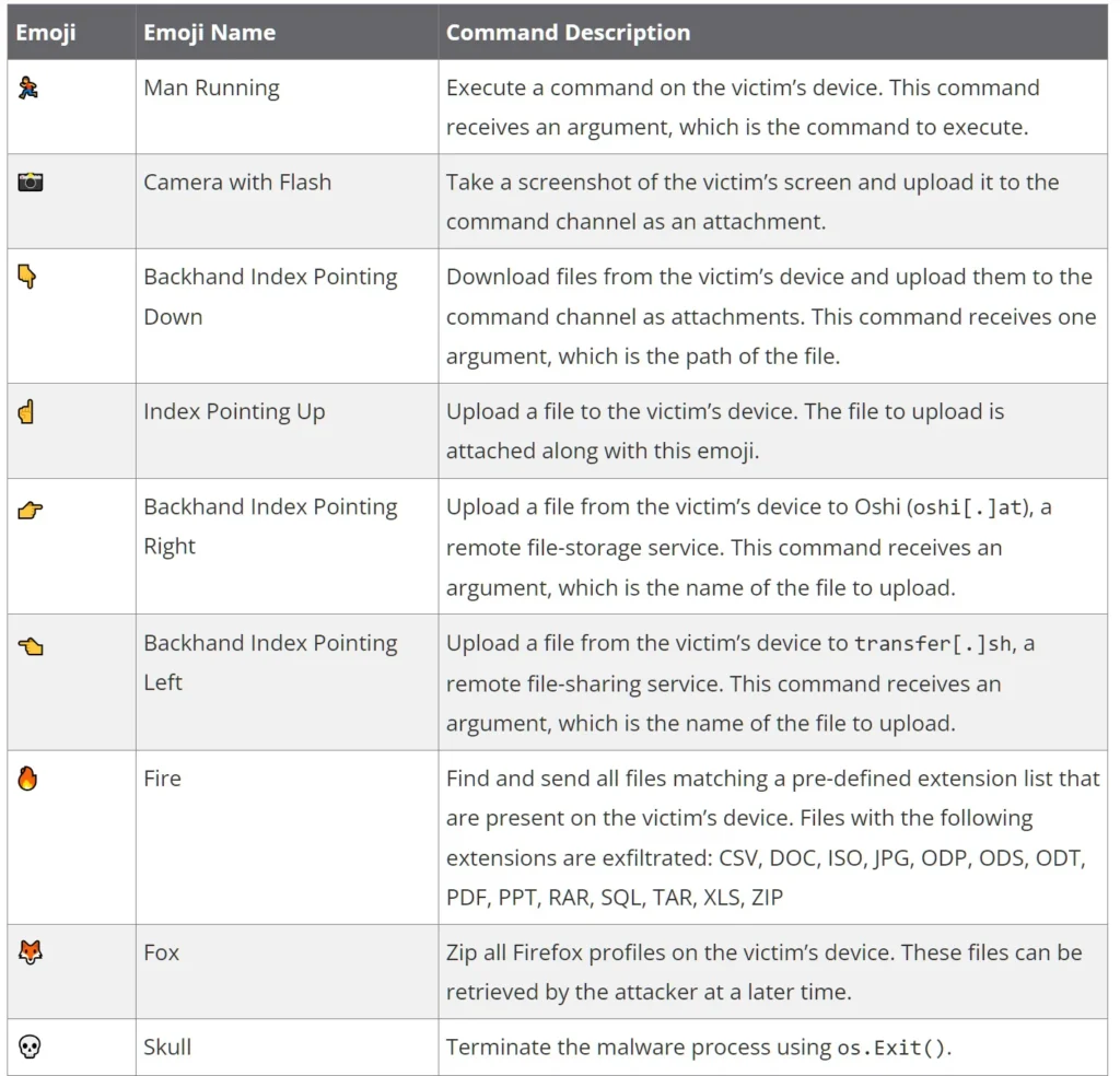 Atunci când este executat, malware-ul afișează un document PDF fals, în timp ce descarcă în background payload-uri suplimentare, inclusiv malware-ul DISGOMOJI și un script shell numit uevent.seqnum.sh conceput pentru a fura date de pe unitățile USB. DISGOMOJI exfiltrează informații despre sistemul informatic, cum ar fi adresa IP, numele de utilizator, numele gazdei, sistemul de operare și directorul de lucru curent, trimițându-le către atacatori. Ulterior, malware-ul folosește proiectul open-source discord-c2 pentru comandă și control, ceea ce permite atacatorilor să lanseze comenzi folosing emoji-uri prin canalele Discord, evitând astfel aplicațiile de securitate care scanează pentru comenzi bazate pe text.